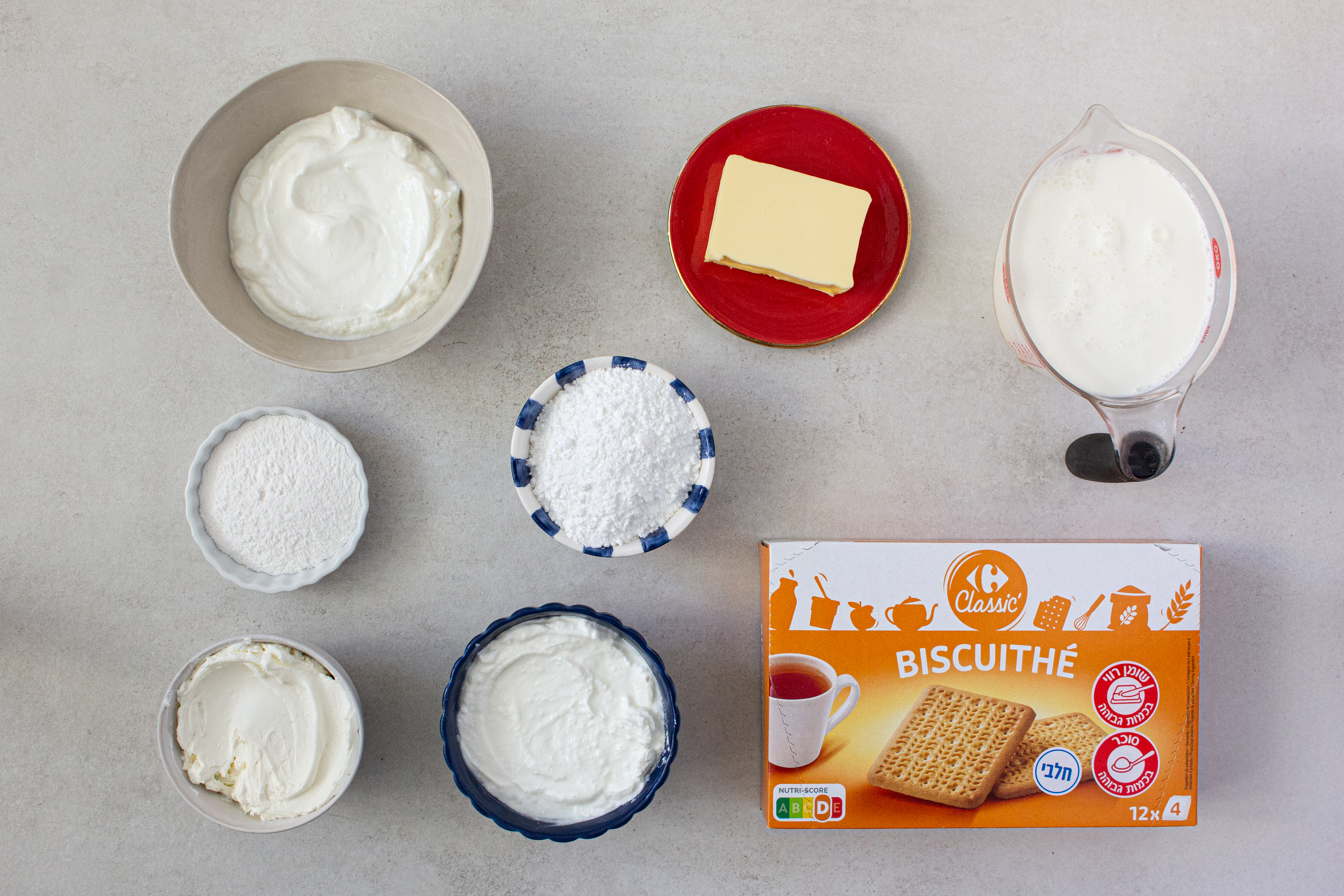 להכנת קרם הגבינה, מקציפים את השמנת המתוקה ואבקת הסוכר לקצפת רכה. מוסיפים את אבקת הפודינג ומקציפים עד לקבלת קרם יציב. מוסיפים את השמנת החמוצה והגבינות ומקציפים עד שמתקבל קרם חלק ואחיד.